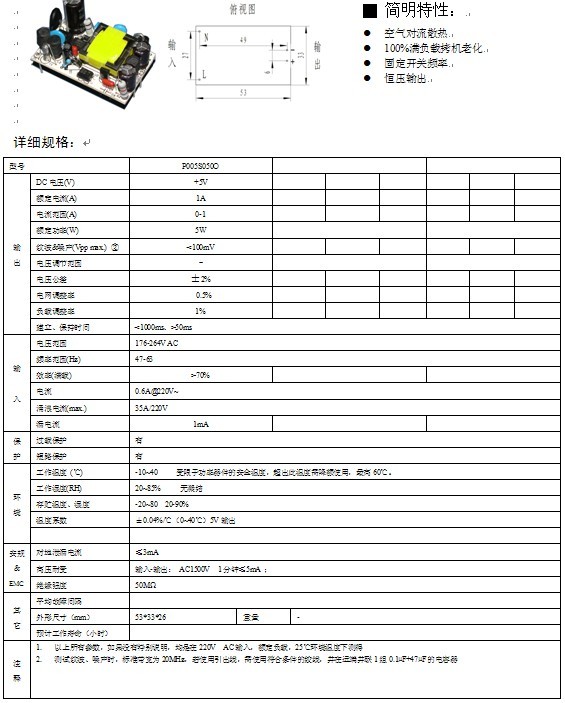 以上是LED開關電源P050S050O的詳細規格參數,所有參數均經過多次測試所得,其安全性和穩定性良好。